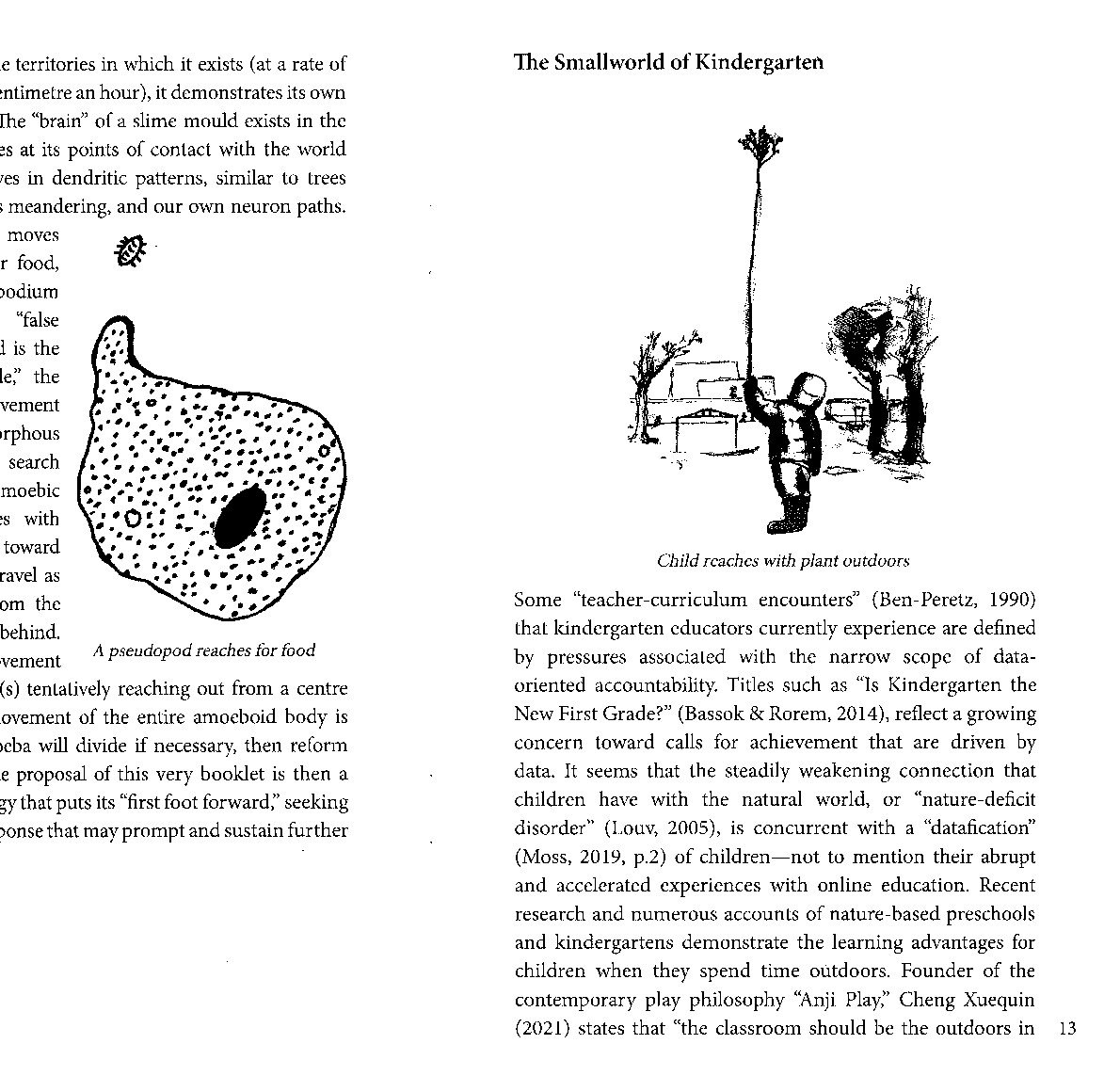 Une belle découverte le petit livre : Kreepingarten Proposal for cryptopedagogical knowledge transfer from/to/between Physarum Polycephalum and Kindergarten Children de Aaron Senitt. L’auteur fait référence aux microbes (slimes) pour penser à une pédagogie et à son enseignement avec les tout-petits. Génial!